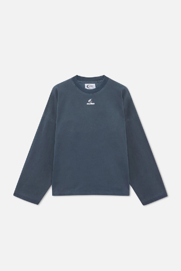Oversized crewneck in navy blue colour. Large ‘Scuffers’ logo screen-printed in white across the upper back. ‘Scuffers’ and our double logo imprinted under the collar.